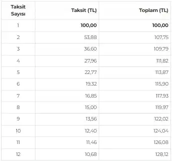 Sitemizde geçerli kredi kartlarınızla yapacağınız taksitli alışverişlerinizde örnek taksit tablosu aşağıdaki gibidir.